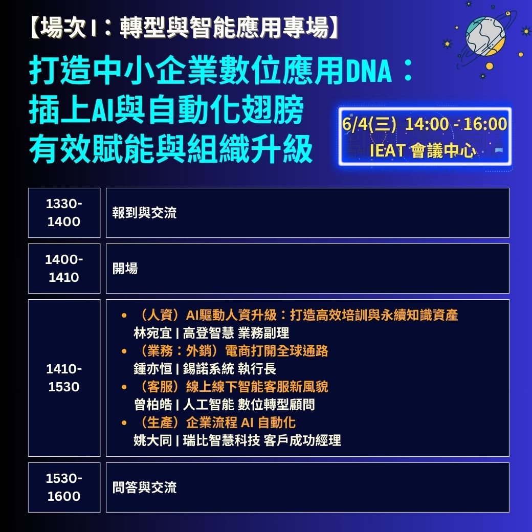 6/4【轉型與智能應用專場】打造中小企業數位應用DNA:插上AI與自動化翅膀,有效賦能與組織升級